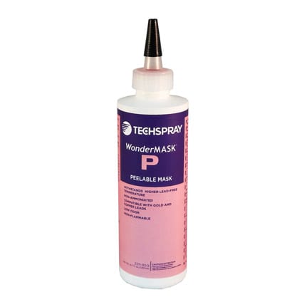 Techspray Wondermask P is a temporary, synthetic latex peelable solder mask that is designed for high lead-free process temperatures. It is fast drying, non-ozone depleting, non-flammable, low odor, non-corrosive, and compatible with copper and gold leads. 8 oz Bottle.